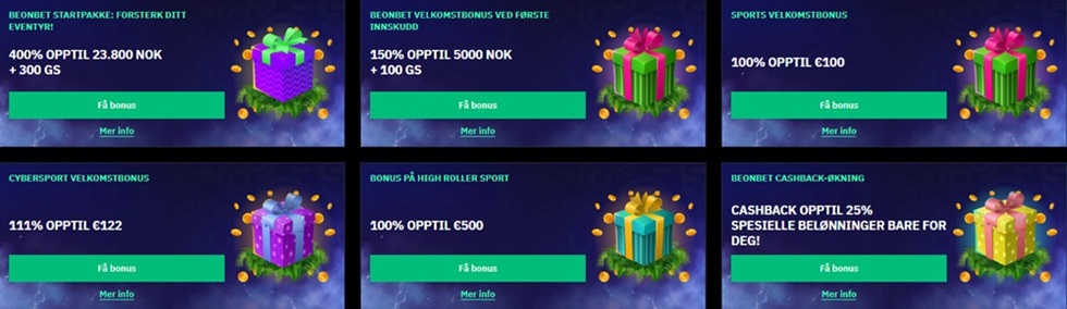 Beonbet tilbyr en fleksibel velkomstpakke for sportsbook-delen, der du kan velge mellom tre forskjellige bonuser – noe som er ganske unikt. Dette gir både vanlige spillere og high rollers en god start, og det er til og med en spesialbonus for e-sport-fans.
