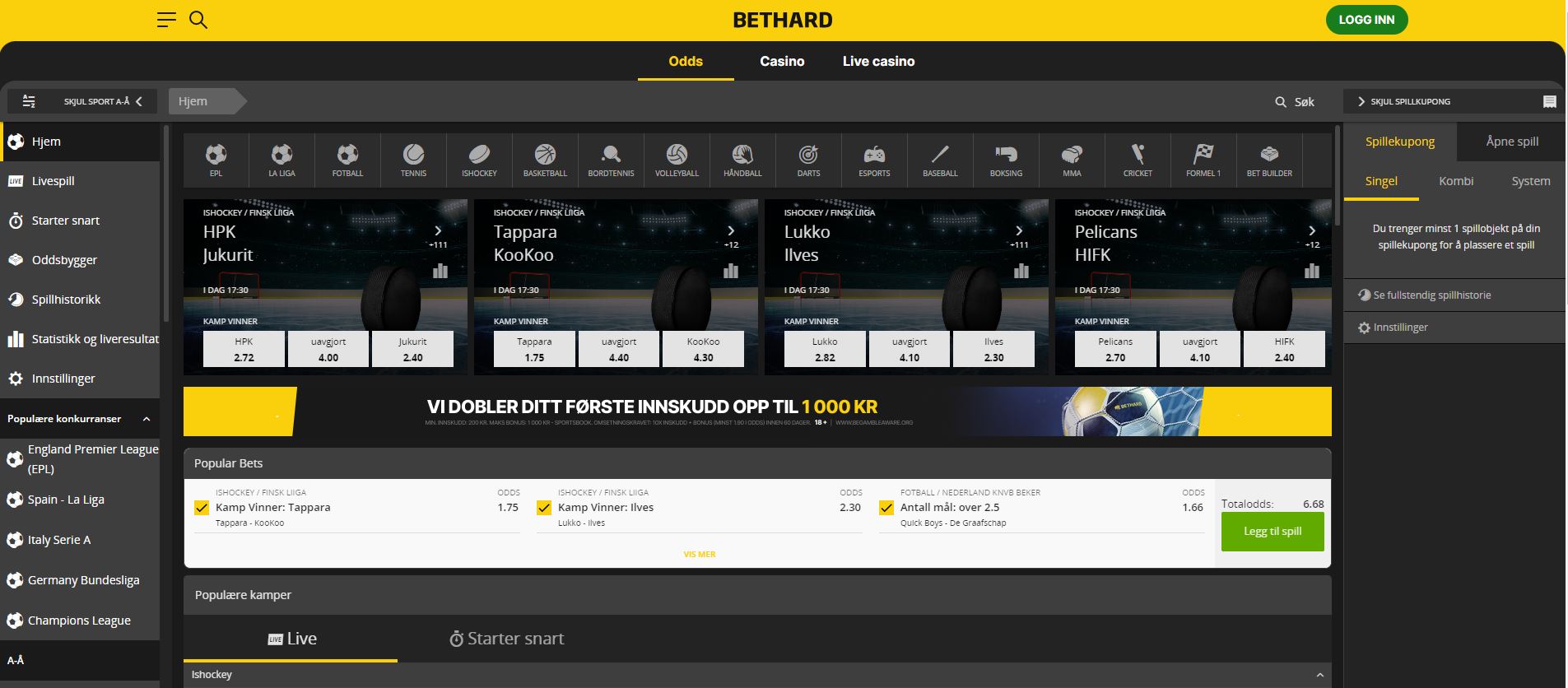 Bethard matcher 100% av ditt første innskudd inntil 1 000 kroner. Sånn umiddelbart ser ikke dette så veldig imponerende ut, men hvis du ser på vilkårene og betingelsene skiller den seg ut med mer moderate omsetningskrav og en overkommelig minimumsodds.