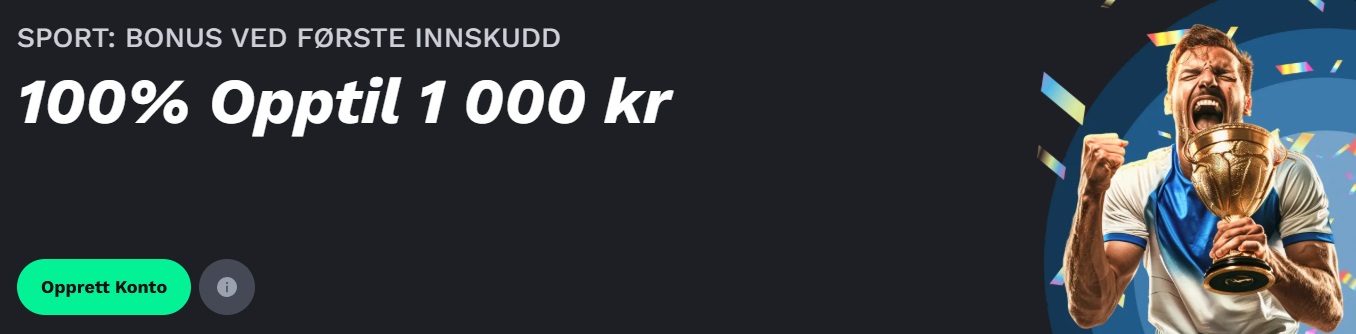 - Velkomsttilbud på første innskudd: 100 % innskuddsbonus opptil 1000 kroner