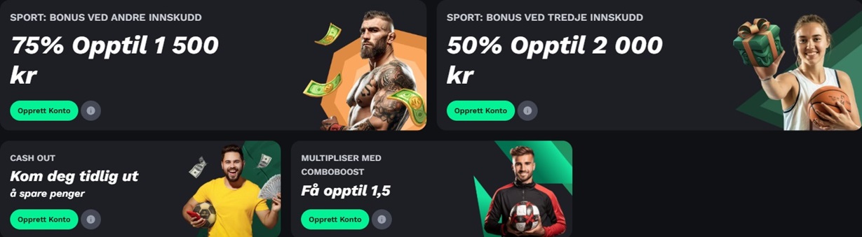 - Velkomsttilbud på andre innskudd: 75 % innskuddsbonus opptil 1500 kroner