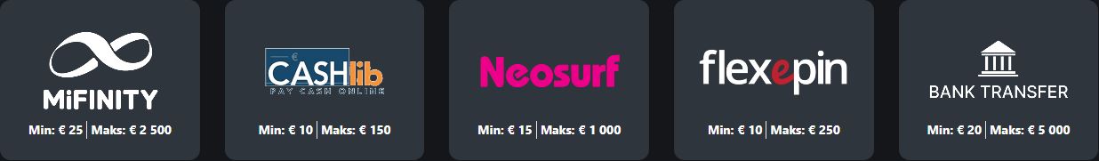 Du kan velge mellom flere innskuddsmetoder, som VISA, MasterCard, bankoverføring, MiFinity, Neosurf og CashLib.