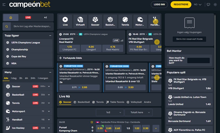 Campeonbet tilbyr pre-match og live betting, oddsbygger, tidlig utbetaling og spesialspill som 0 % margin på utvalgte kamper.