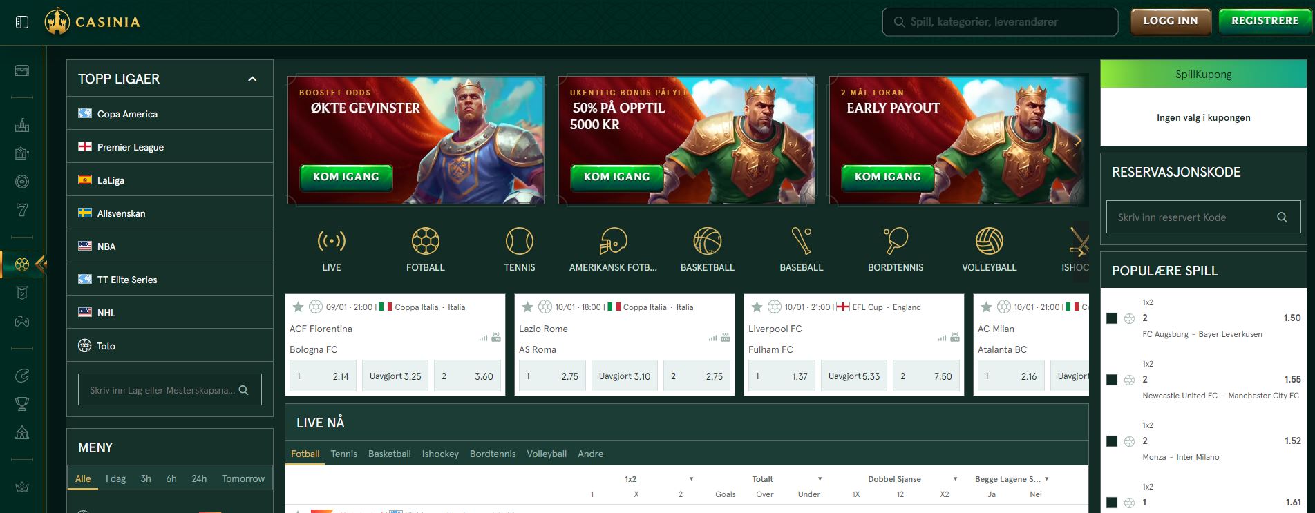 Casinia er en komplett spillside der du får alt du trenger av underholdning på ett og samme sted. Selv om navnet kanskje antyder at hovedfokuset er på casino, er det ingen tvil om at de også har lagt mye arbeid i å tilby en best mulig oddsavdeling. I Casinias sportsavdeling kan du spille på alle populære og mindre populære sporter fra hele verden. Les mer om Casinia Sport her.
