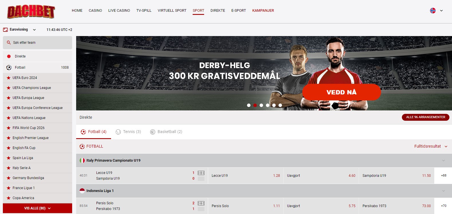 - Konkurransedyktig odds: Oddsen hos Dachbet er på linje med det vi ser ellers i bransjen, spesielt for de mest populære ligaene og sportene.