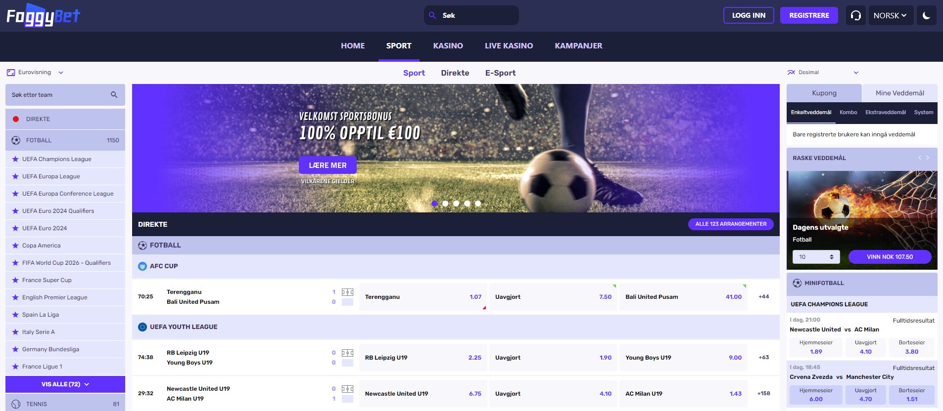 Foggybet er et spennende tillegg til oddsverdenen, hvor det meste ligger til rette for en førsteklasses spillopplevelse. Her vil du finne et hav av sportsgrener og ligaer fra alle verdenshjørner, og du vil kunne nyte godt av det fantastiske brukergrensesnittet plattformen har å by på.