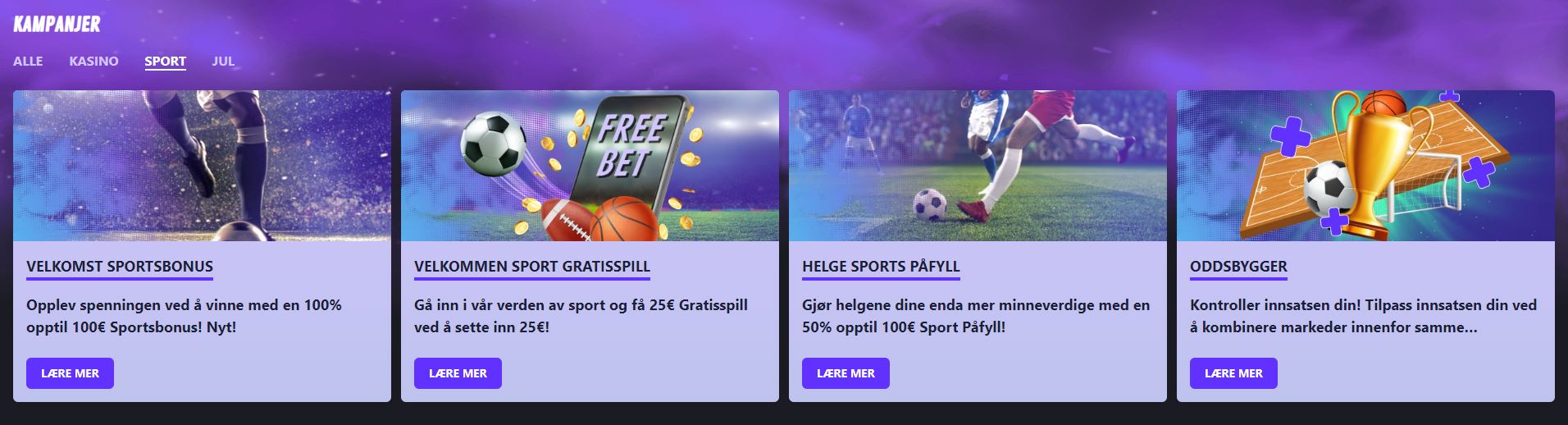 Når du har kost deg ferdig med velkomstbonusen, har du enda flere godsaker i vente. Hvis du klikker deg inn på kampanjesiden og filtrerer etter sportsbonuser, vil du blant annet se følgende:
