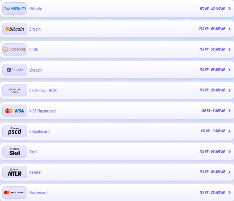 Krypteringsteknologi og strenge sikkerhetsprotokoller sørger for at alle disse betalingsmetodene er 100 % trygge å bruke. Minsteinnskuddet er 120 kroner, og det høyeste tillatte innskuddsbeløpet per transaksjon er 50 000 kroner (ved bruk av kryptovaluta).