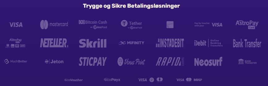 Du kan sette inn penger med Visa, Mastercard, Paysafecard, MiFinity eller ulike kryptovalutaer som Bitcoin, Ethereum og Ripple.