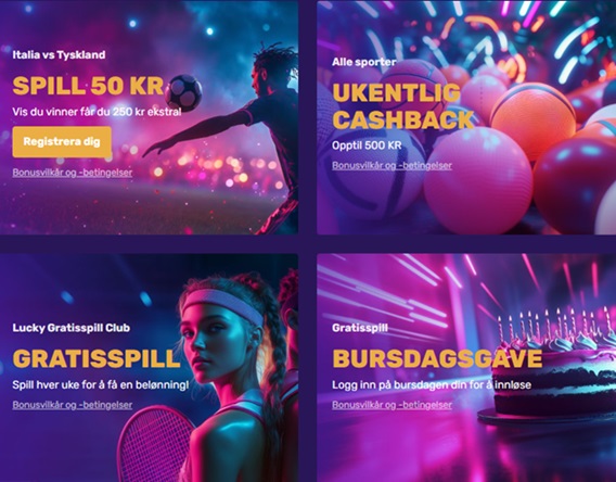 - Ukentlig cashback: Cashback blir kreditert som gratisspill hver mandag basert på nettotap fra mandag til søndag uken før. Gratisspillet må brukes innen 7 dager med minsteodds 1.50.