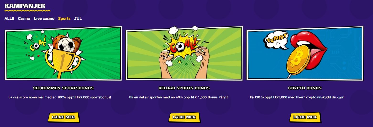 - Kryptobonus: Plasser innskuddet ditt via kryptovaluta og kontakt kundeservice for å få en daglig bonus! Dette tilbudet kan gi deg inntil 5000 kroner i bonus og krever et minsteinnskudd på 250 kroner.