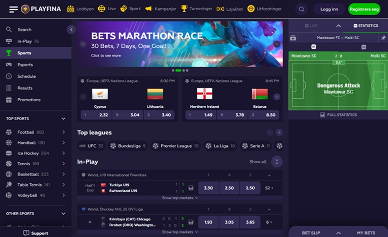 Playfina skiller seg ut med sitt omfattende esport-tilbud og en brukervennlig plattform med god ytelse. Live odds oppdateres raskt, og funksjoner som hurtigbet og cashout gjør opplevelsen mer dynamisk. Personlig er jeg også en stor fan av det statistiske senteret.
