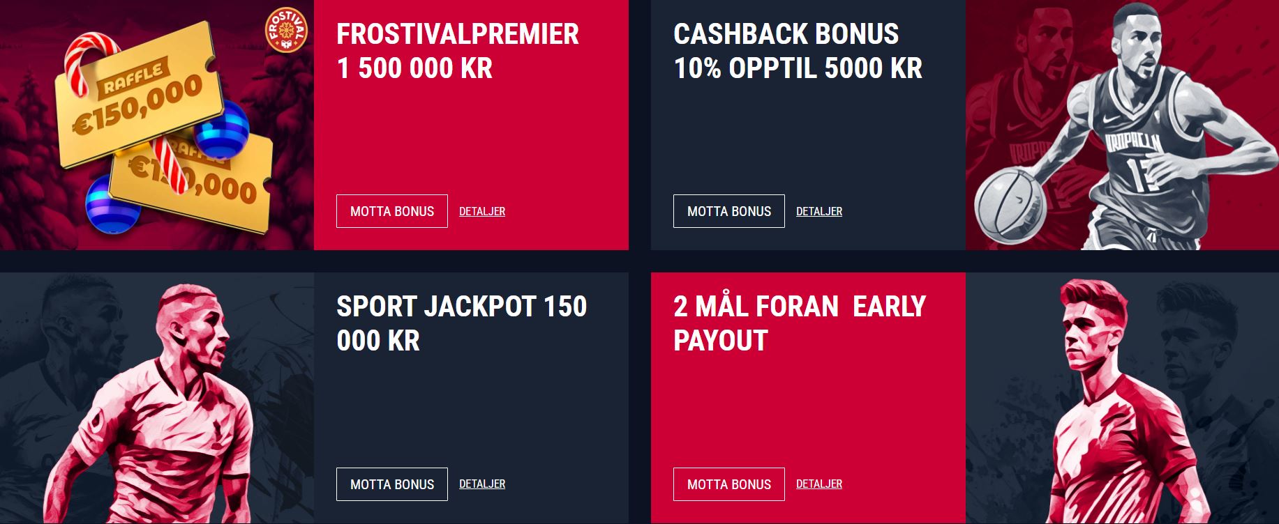 Velkomstbonus, cashback-bonus, sportsjackpot, hestespill-bonus, ukentlig reload-bonus og en unik kortsamlingskampanje.