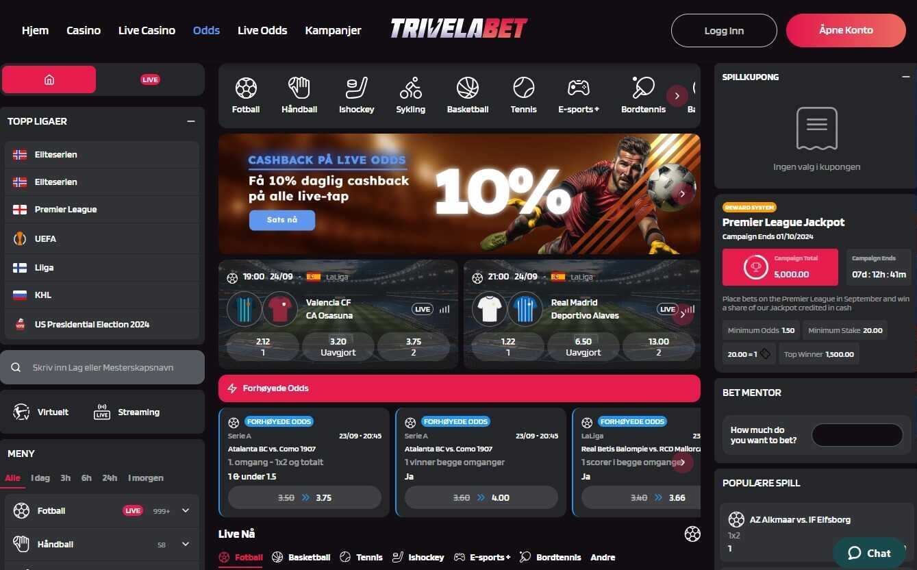 Jeg pleier å være litt skeptisk til nylanserte sportsbooker da de ofte pleier å ha noen barnesykdommer og mangle en og annen viktig detalj eller funksjon. Men dette ser ikke ut til å gjelde Trivelabet. Jeg har testet denne sportsbooken grundig, og nedenfor kan du lese mer om alle aspektene jeg har gått nøye etter i sømmene.