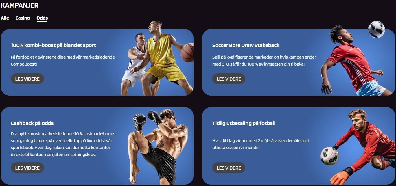 - Kombi-boost: Det første tilbudet på kampanjesiden er ComboBoost-funksjonen, som gir deg muligheten til å vinne inntil 100 % mer enn du ellers ville gjort. Alt du trenger å gjøre for å utnytte tilbudet er å legge enkeltspill med minst 1,40 til spillkupongen. En trippel vil gi 3 % boost, mens en 20-dobbel vil gi den maksimale boosten på 100 %.