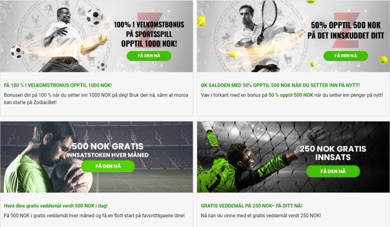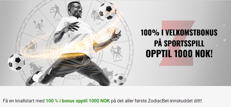 Velkomstbonusen hos Zodiacbet Odds tilbys til alle nye kunder som setter inn penger for første gang. Den gir 100 % opptil maksimalt tusen kroner.