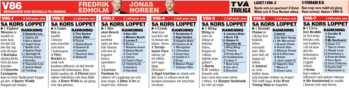 Ranking, startlistorna, kusk- och tränarsnack samt V86-panelen med stjärnkuskarnas bästa tips klicka på länkarna nedan (pdf-filer):