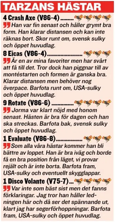 6 Crash Axe (V86-4) som är så fin häst verkar inte få spelarnas förtroende den här veckan. Visst, han är bara en av många som har ungefär likvärdig chans. När han bara är streckad på 5% procent är han dock högintressant. Formen sitter där, det har han bevisat i årets samtliga starter. Och han blir knappast sämre med de här loppen i kroppen.