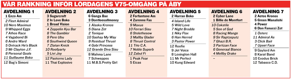 | V75-7 | 6-Don Fanucci Zet Wow, vad ska det bli av den här hästen. Är under stark utveckling. Rejäl spurt senast, uppvisning vid V75-seger näst senast. Kommer att gå med – Amerikansk vagn. En klockren luring att köpa med på kupongen gott folk!