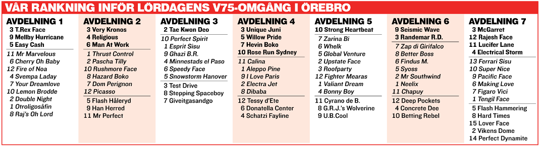 Spetsanalys Ovisst. 2 Double Night öppnar bra, liksom 3, 4 och 6. 7 är ingen blixt, men bra läge och vass startkusk. Vi säger knapp fördel för 3 T.Rex Face.
